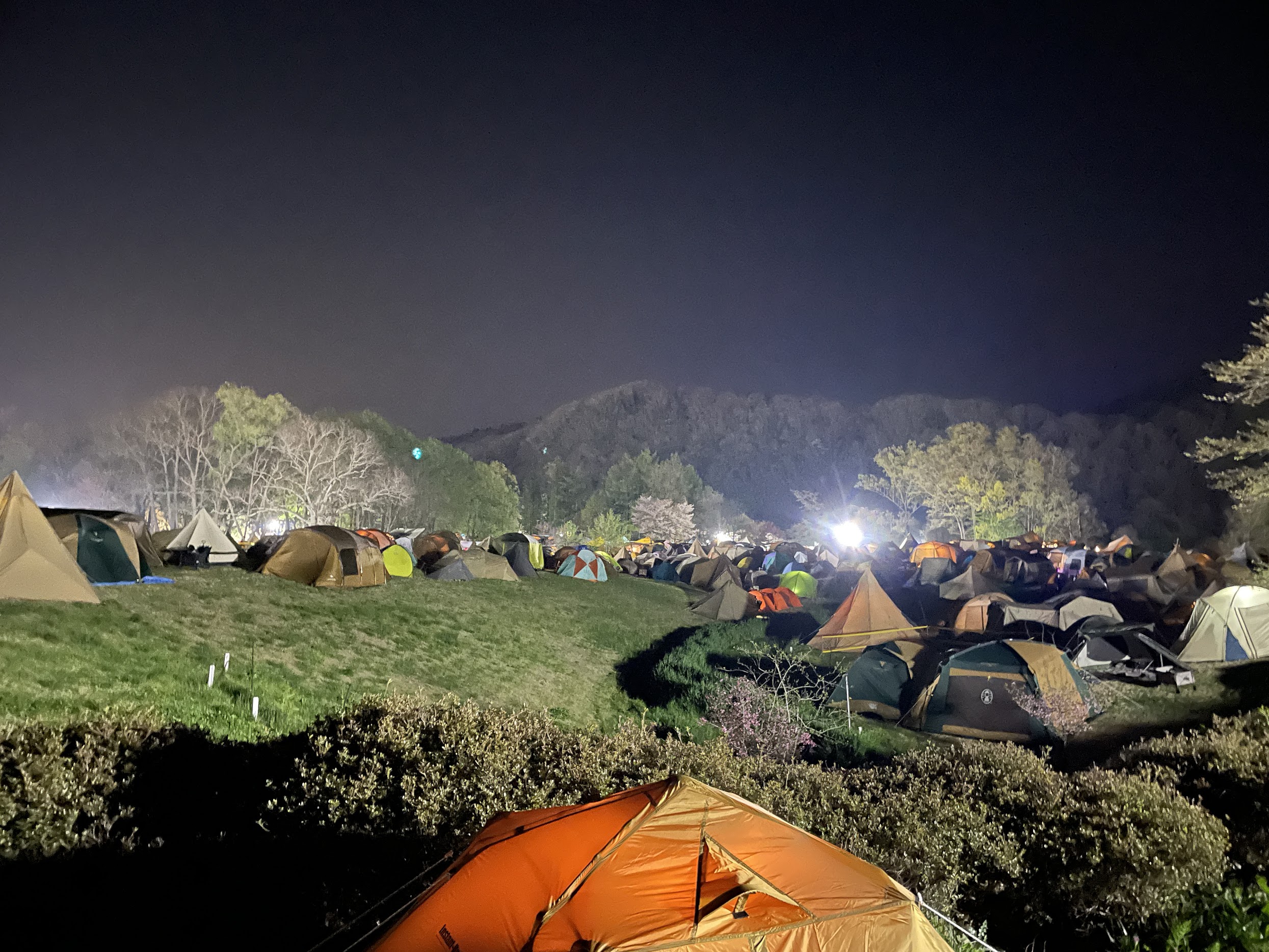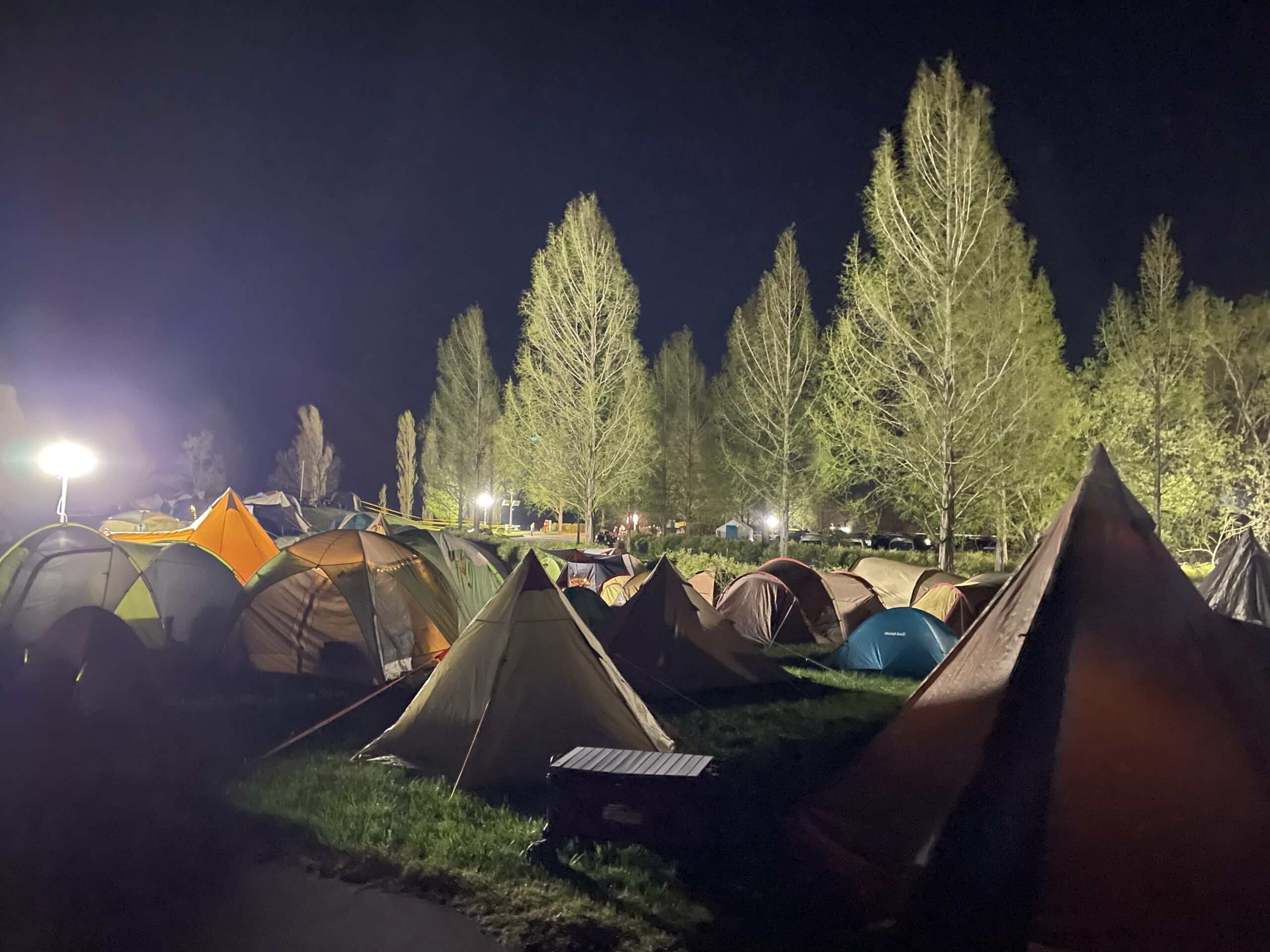 完全にHP0ですが夜のテントサイトの雰囲気は格別です。 完全に日が落ちると、各テントから漏れるランタンの優しい光がポツポツと点在し、まるで小さな村のような幻想的な空間に。